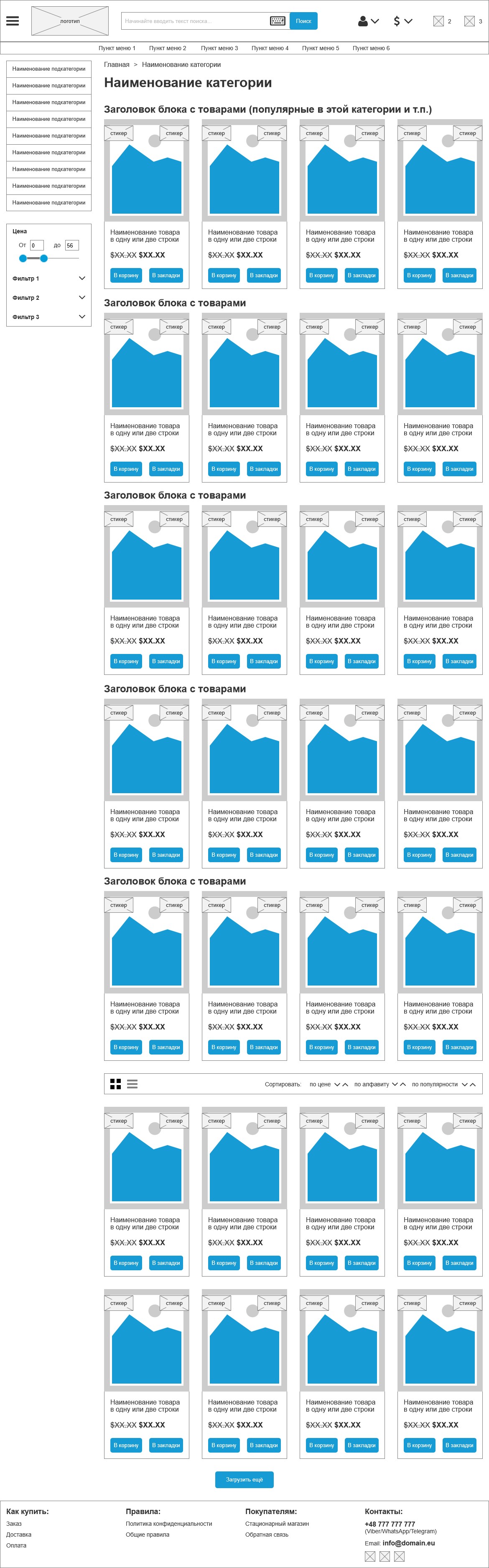 После внесения правок и утверждения прототипов дизайнер приступил к рисованию дизайн-макетов будущих страниц. Дизайн выполнен на светлом фоне для комфортного просмотра каталога товаров, а в качестве основного акцента выбран оранжевый цвет из логотипа, он используется для кнопок, стикеров на товарах и других интерактивных элементов.