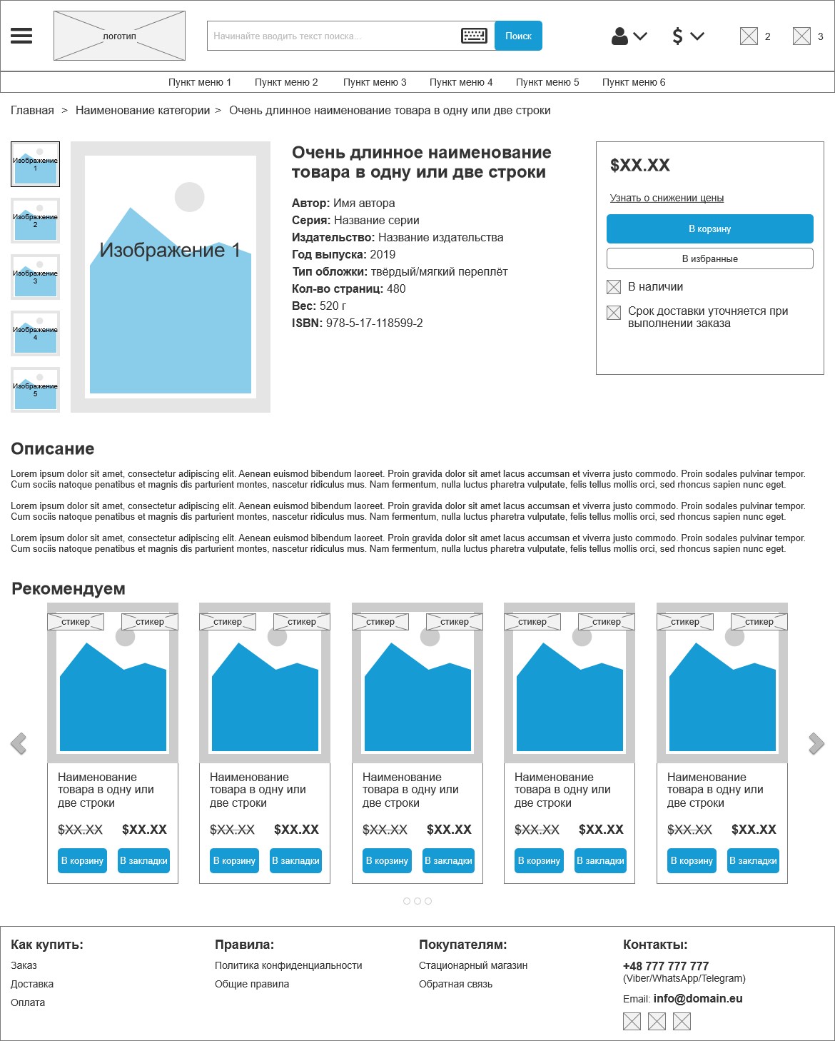 Страница товара содержит подробное описание с характеристиками и мини-галерею с изображениями товара. На странице товара можно добавлять товар в избранные и в корзину, указав при этом количество и способ доставки. Под описанием расположены 2 блока с похожими товарами и ранее просмотренными.
