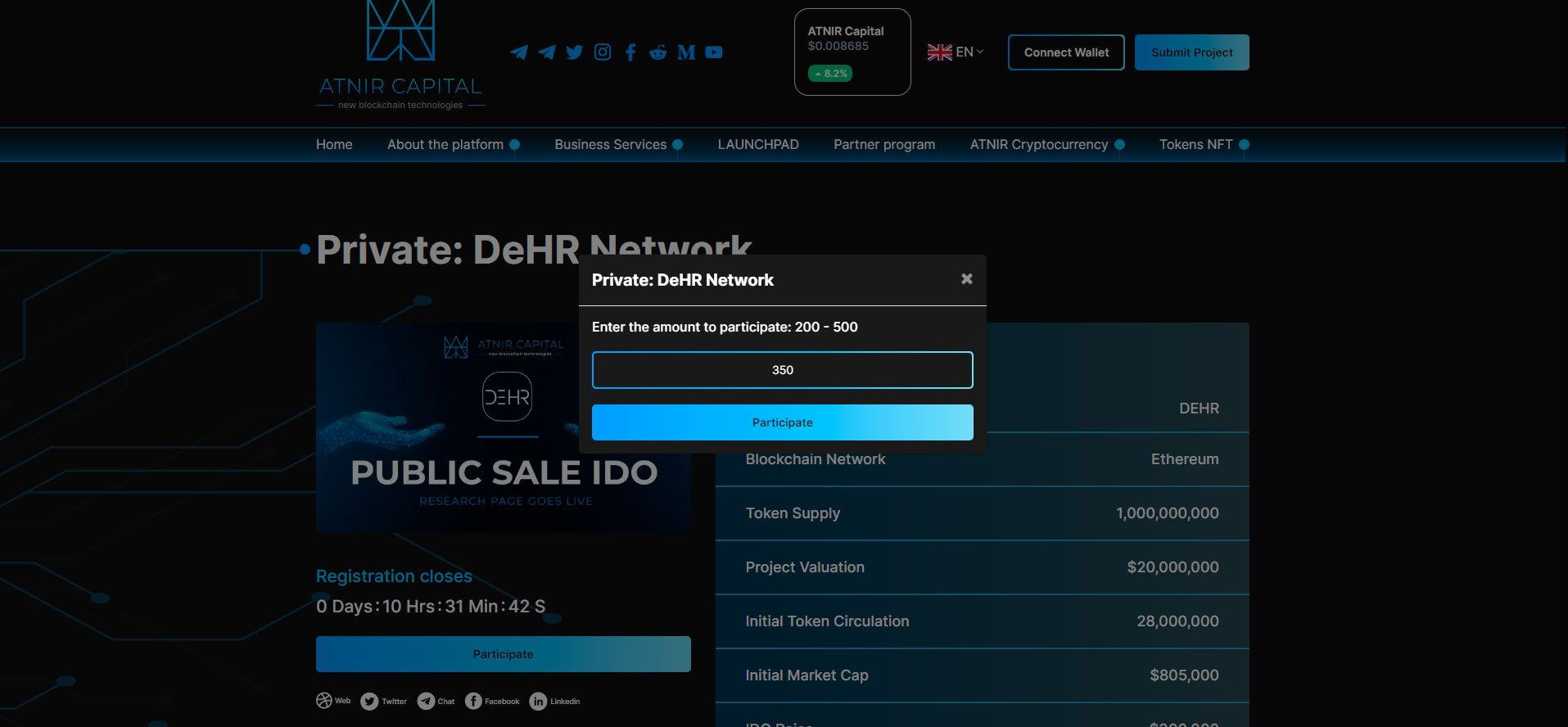 Когда кошелёк привязан, пользователь может участвовать в конкурсе, вложив в проект сумму в указанном диапазоне.