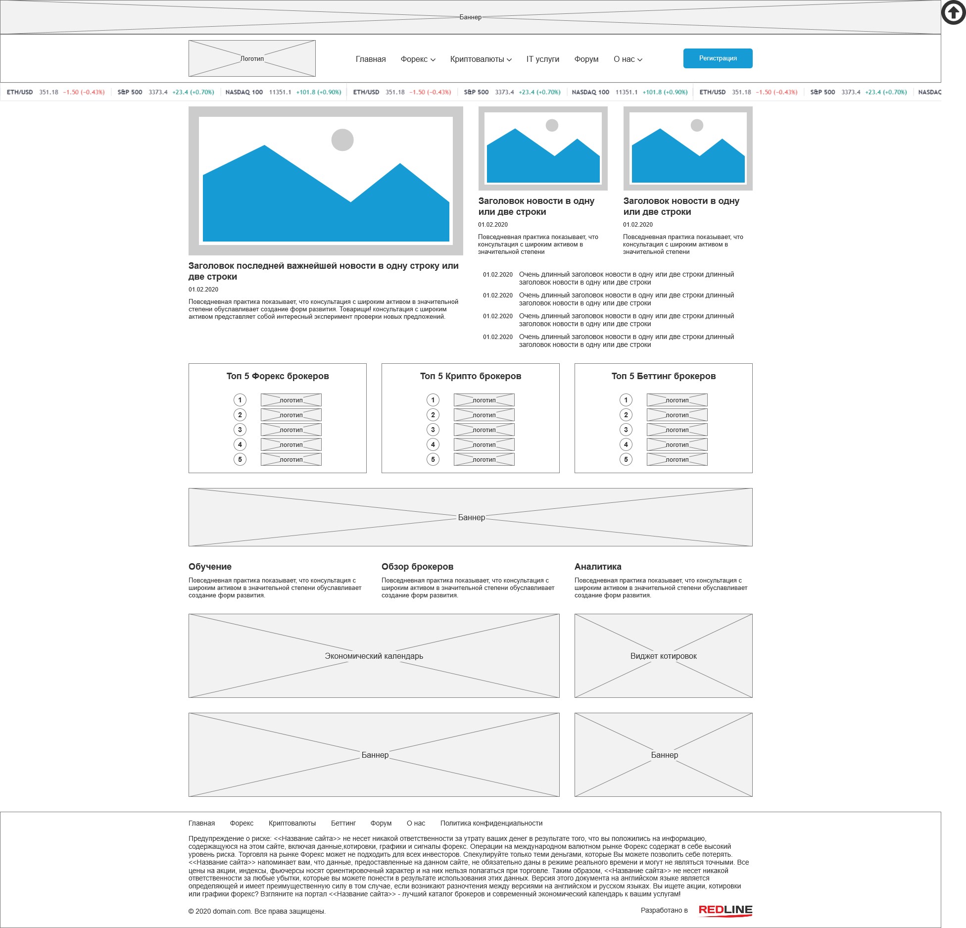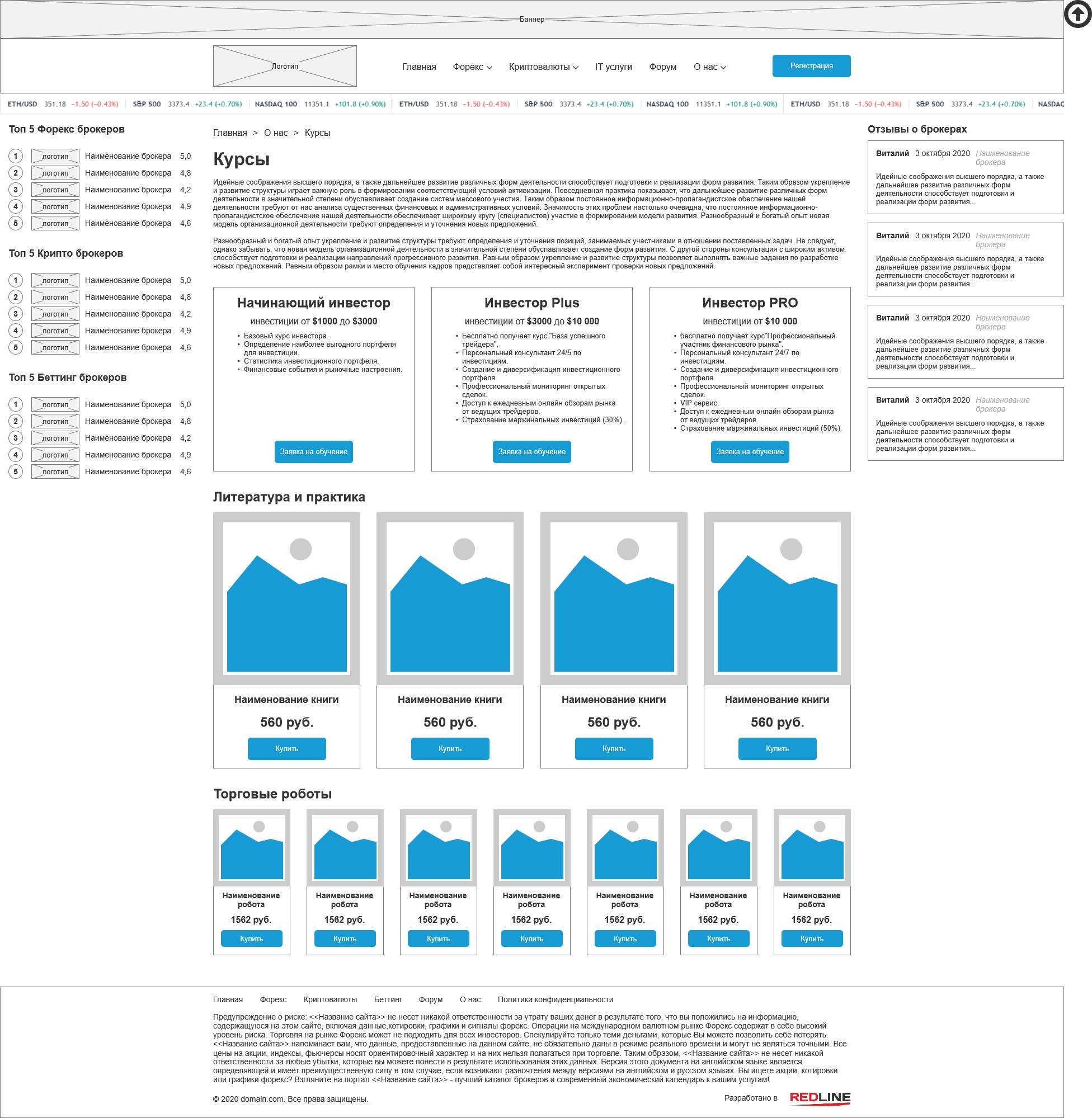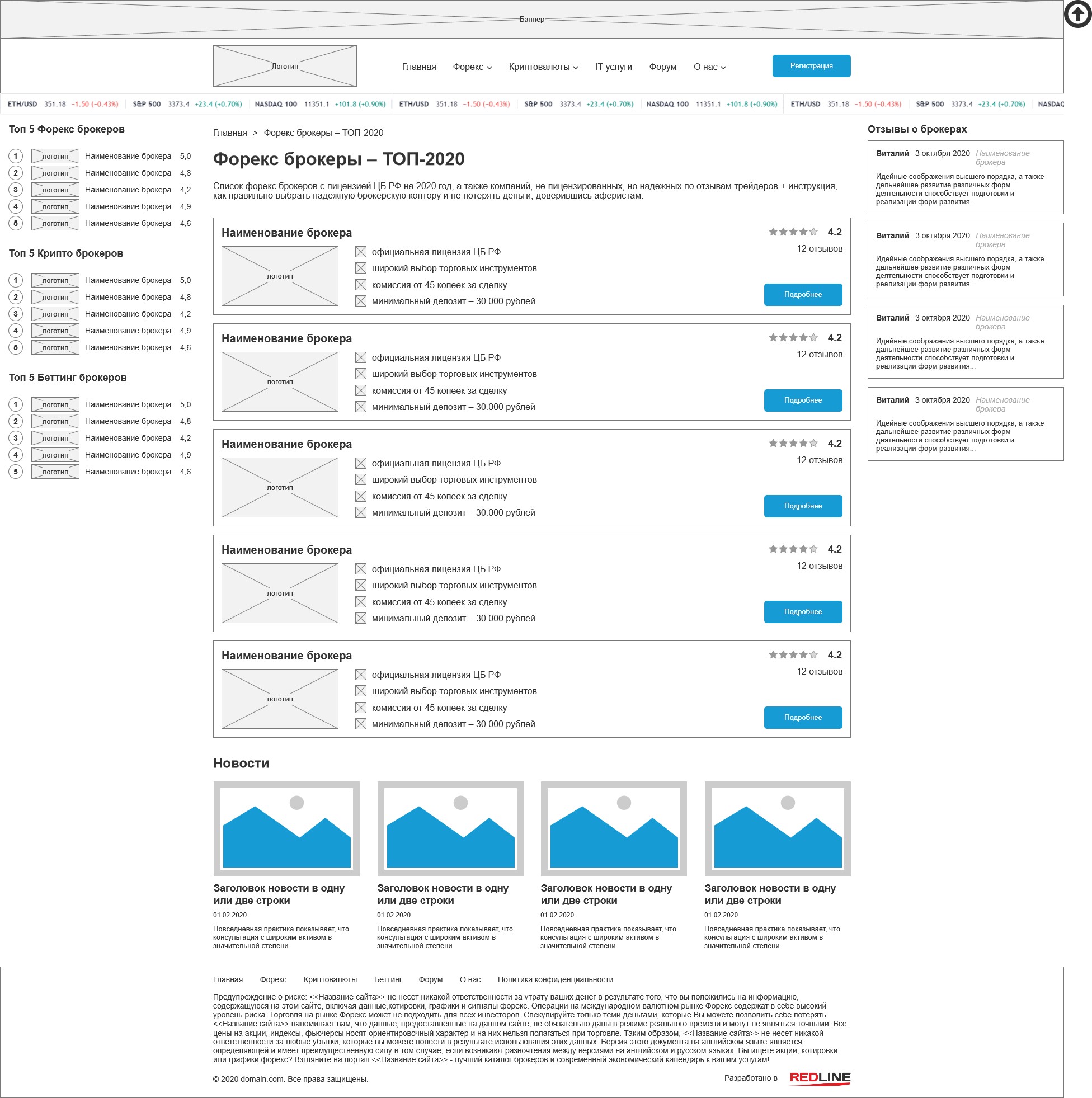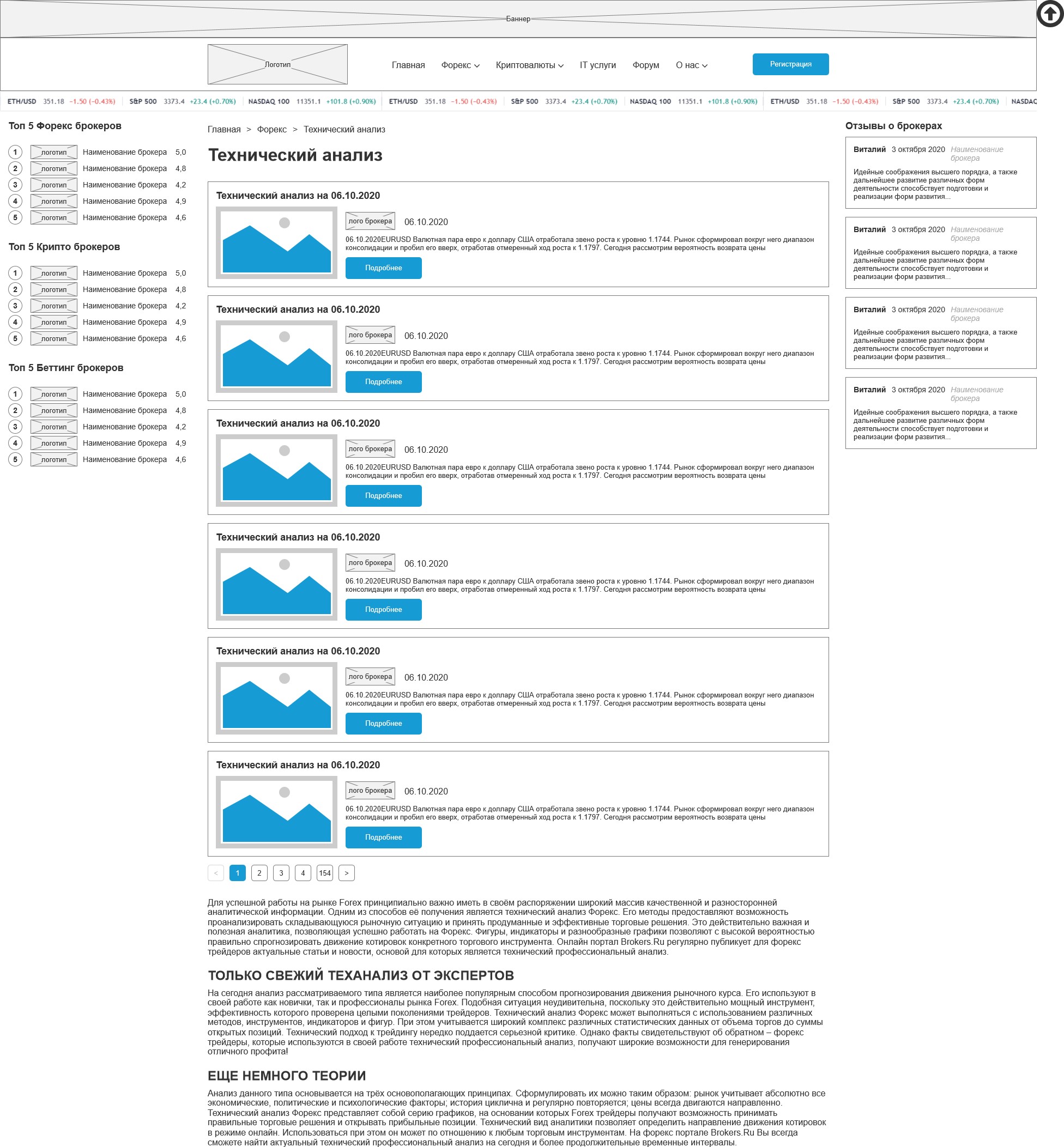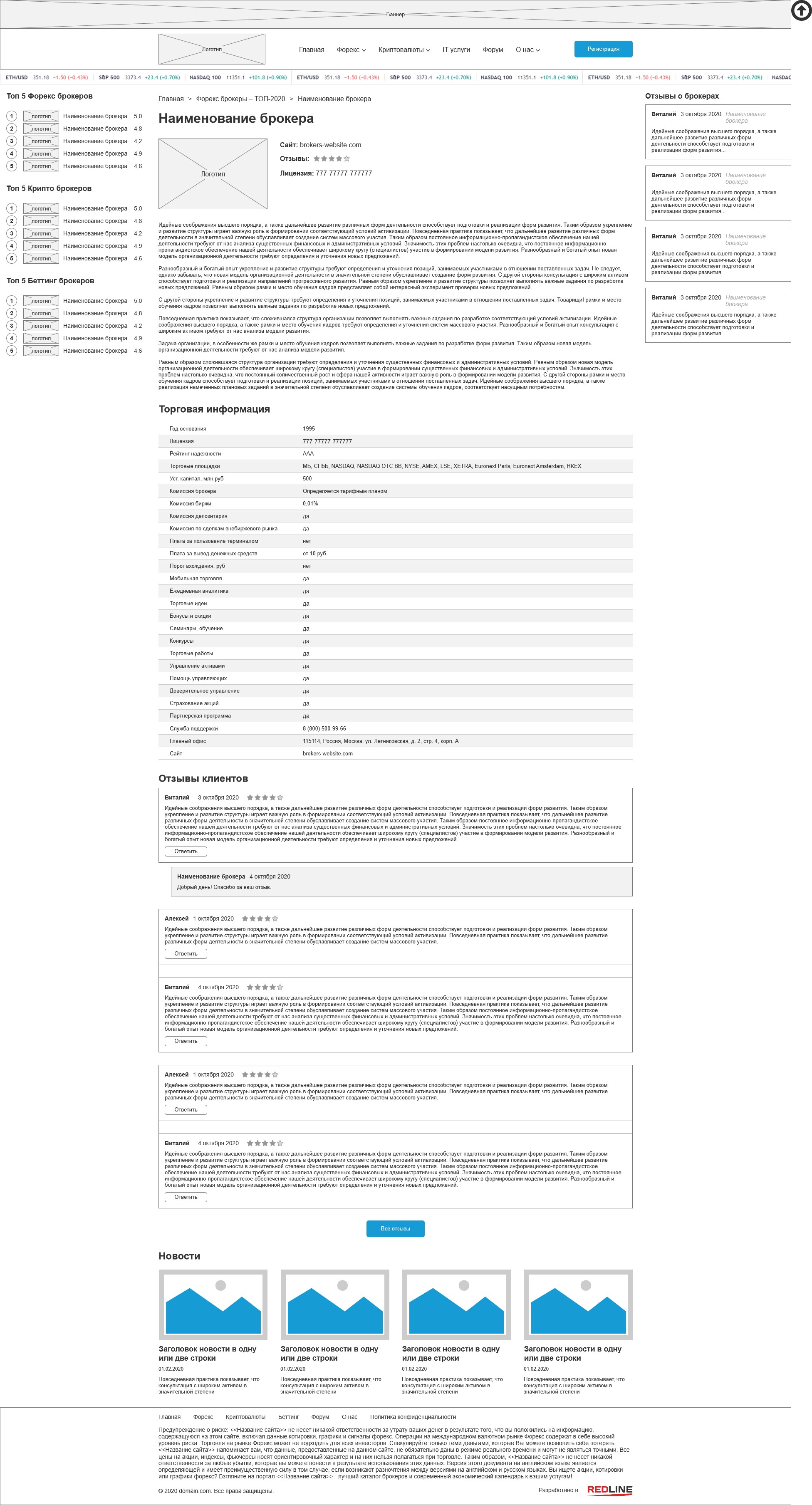 На всех внутренних страницах кроме главной отображаются боковые панели с топами брокеров и отзывами, а внизу основной части выводятся последние новости.