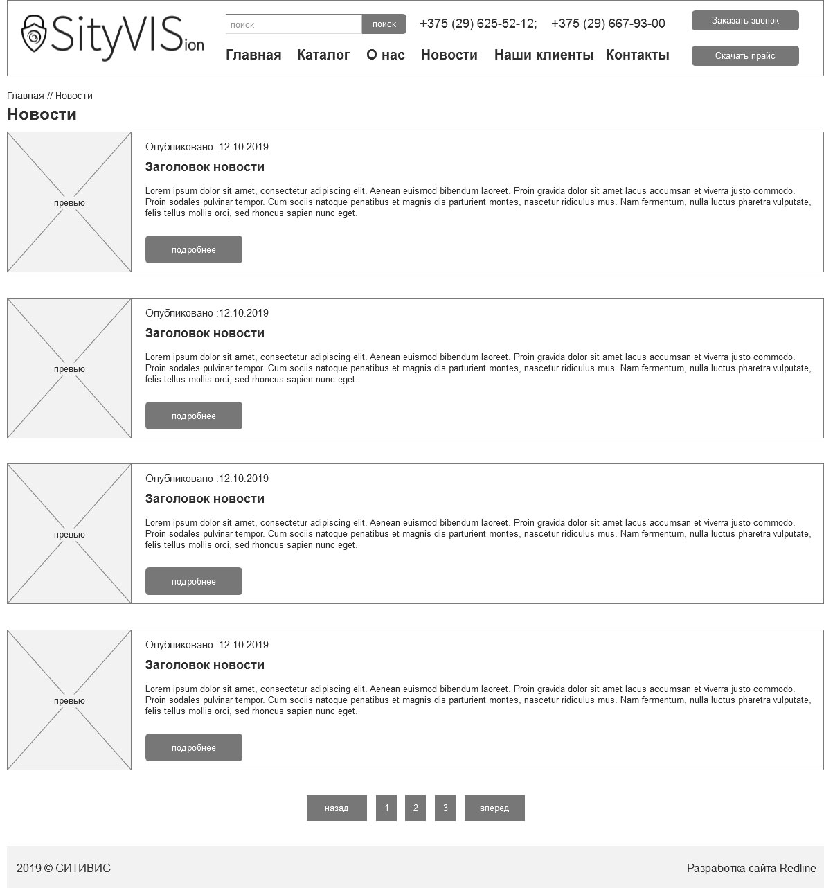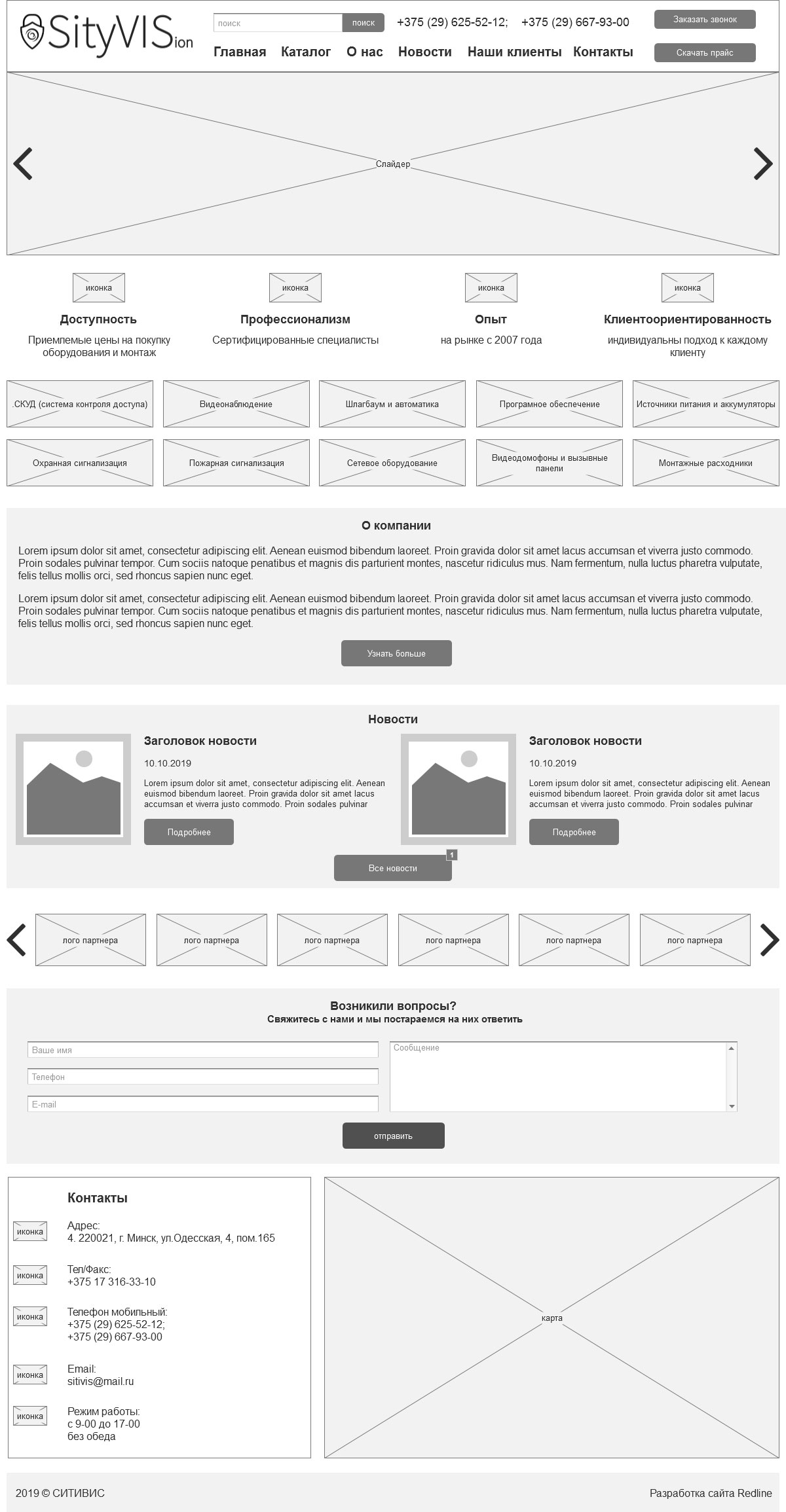 После внесения некоторых правок и утверждения прототипов дизайнер приступает к отрисовке дизайн-макетов. Дизайн сайта выполнен на светлом фоне, а основной цвет выбран в соответствии с новым логотипом. На главной странице расположен слайдер с акциями и новостями, блок с категориями каталога, последние новости, форма обратной связи и контактная информация с интерактивной картой.