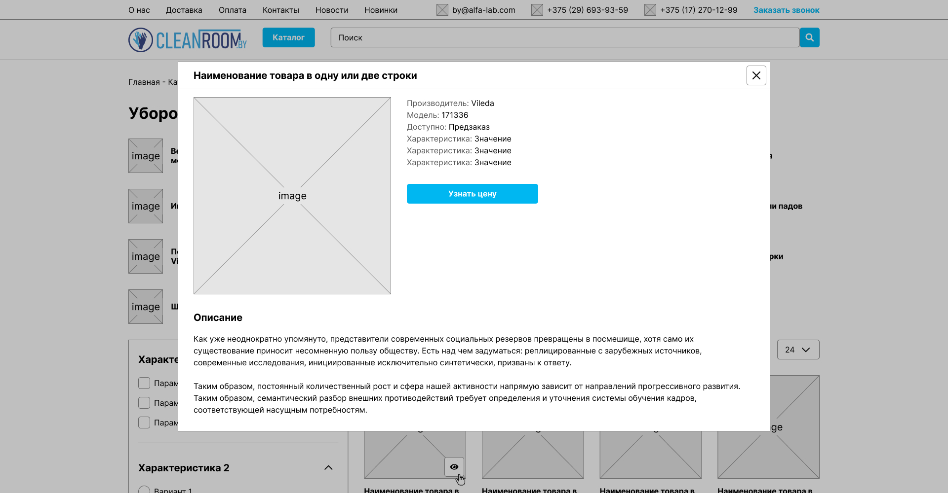 Разработка любого сайта начинается с прототипирования нетипичных страниц будущего сайта, строение и дизайн которых будут отличаться от всех остальных. Дизайнер расположил ключевые блоки и интерактивные элементы на прототипах, опираясь на техническое задание и заполненный бриф. Для сайта CleanRoom были созданы прототипы 7 страниц и 1 модального окна: