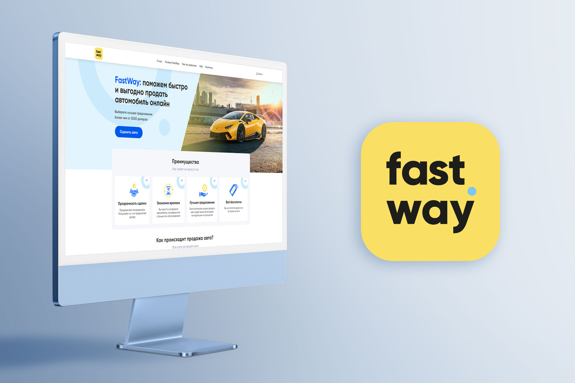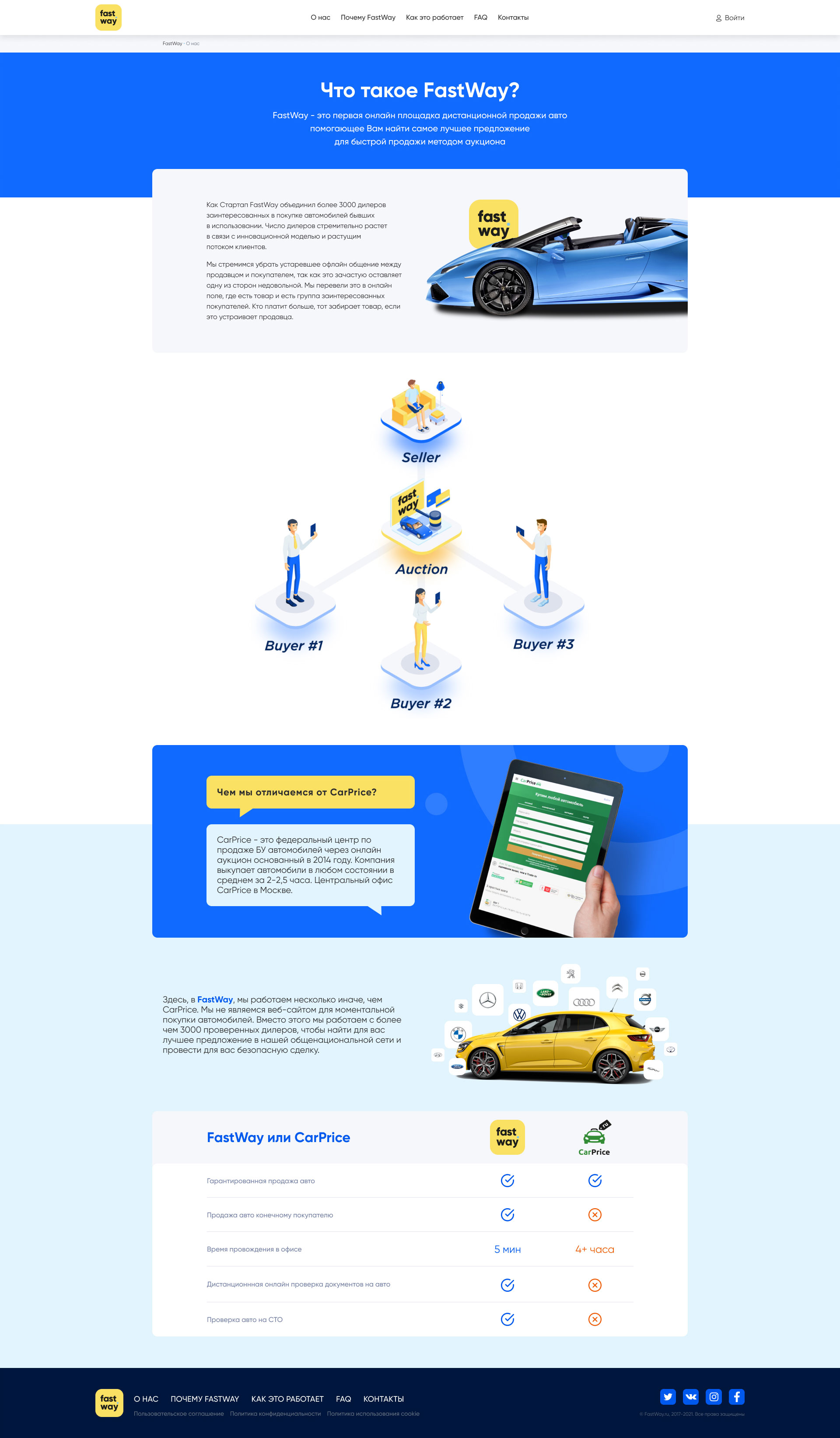 На странице "Почему FastWay" пользователи могут узнать, что они получат от продажи или покупки авто на платформе FastWay. Для этой страницы дизайнер также отрисовал индивидуальные иконки в стиле всего сайта.