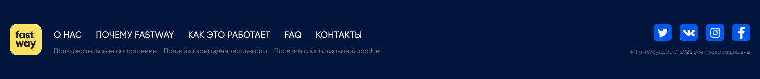 Подвал содержит логотип, информацию об авторских правах и юридическом лице, меню, ссылки на политику конфиденциальности и использования coockie, и ссылки на страницы в соцсетях в виде иконок.