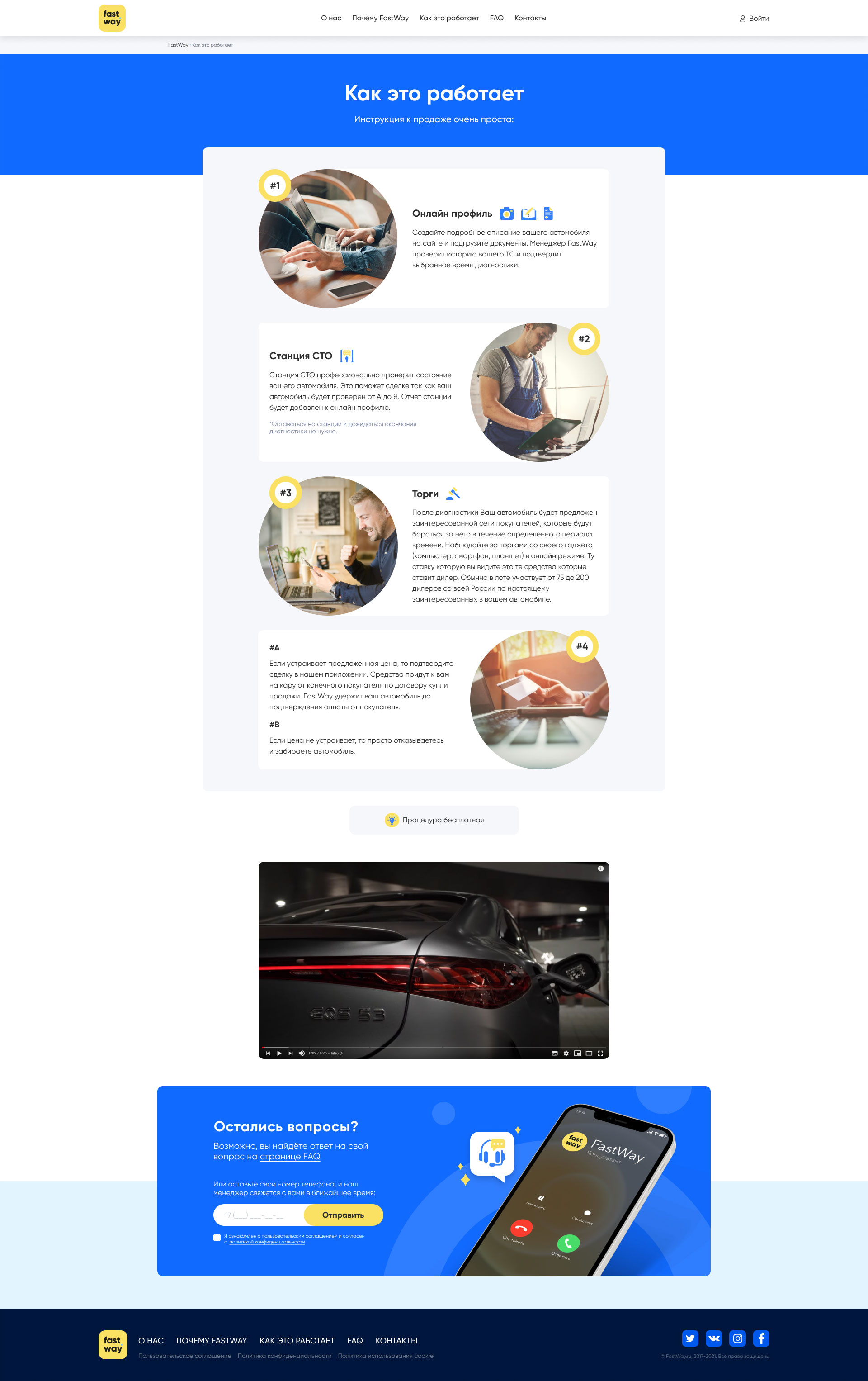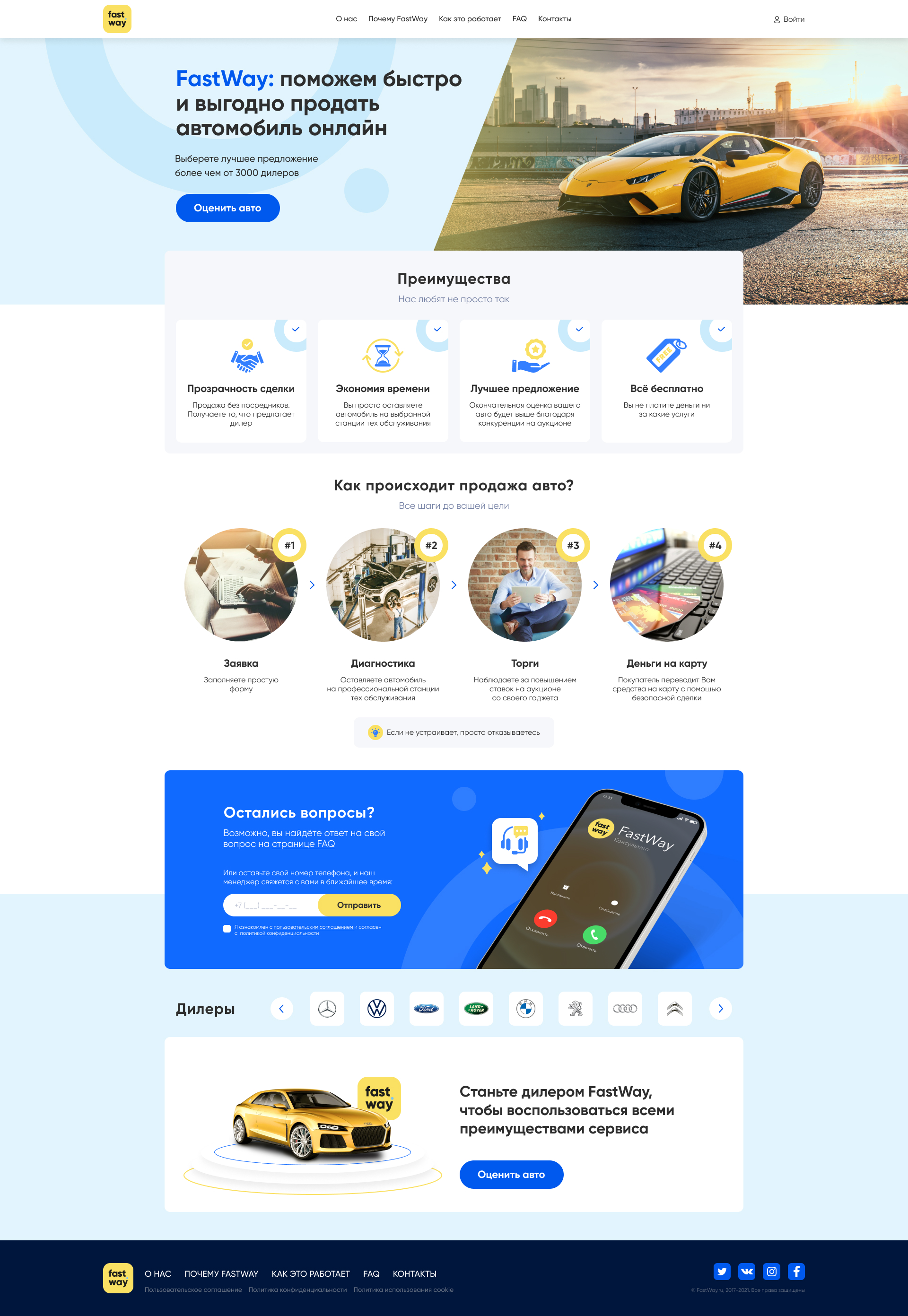 На главной странице кратко описаны преимущества сервиса и пошаговый процесс продажи авто с индивидуально отрисованными иконками и иллюстрациями. Пользователь может оставить свой номер телефона в специальной форме для связи с менеджером.