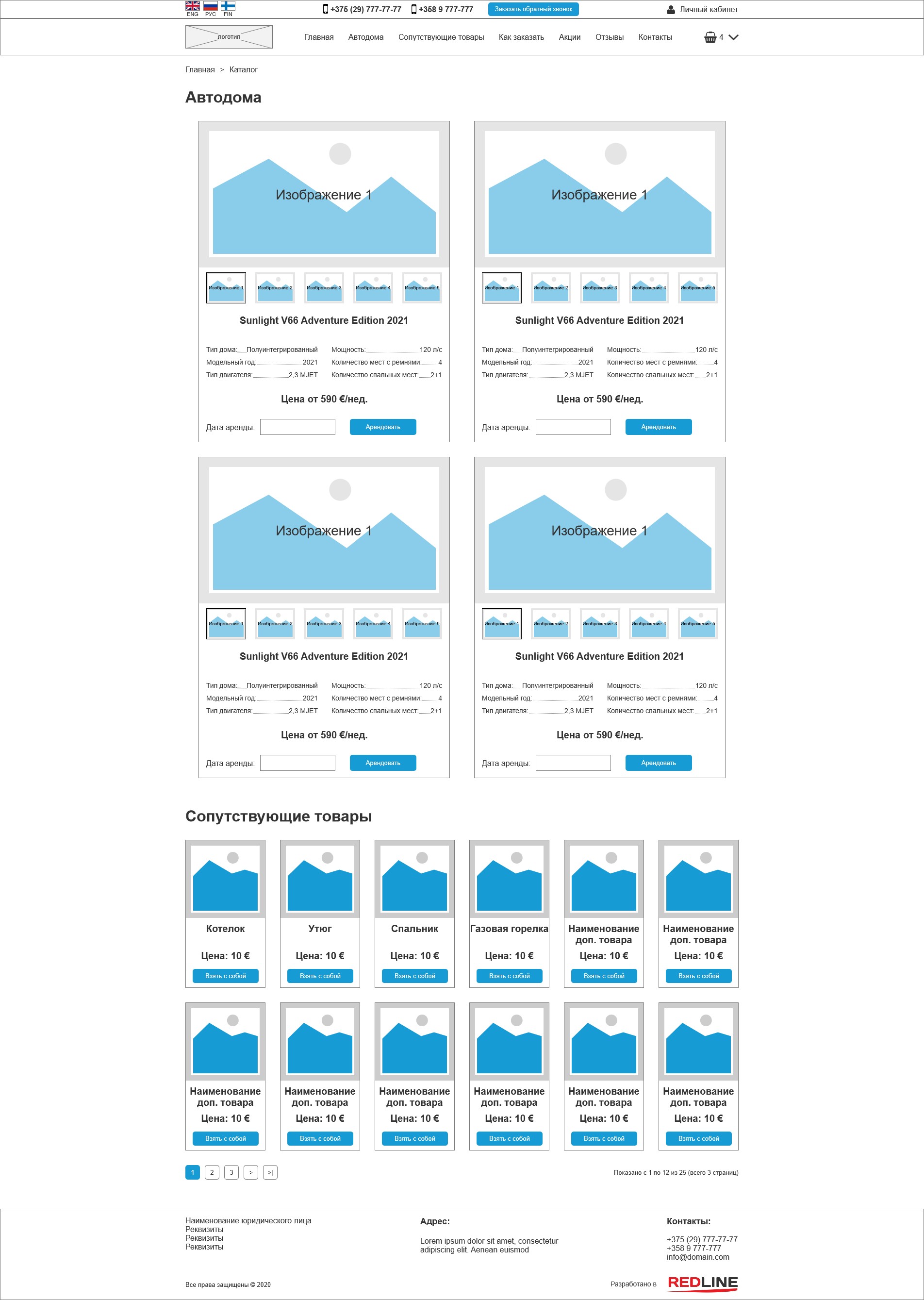 Функционал движка был расширен так, что теперь в каталоге имеется два типа товаров: автодома и дополнительные товары. Добавить дополнительные товары в корзину можно только после того, как будет добавлен автодом. В то же время автодом можно добавить только если корректно выбраны даты начала и окончания аренды. при просмотре списка автодомов на главной страницы или на странице каталога, пользователь может просмотреть приложенные фотографии в минигалерее, и добавить автодом в корзину.