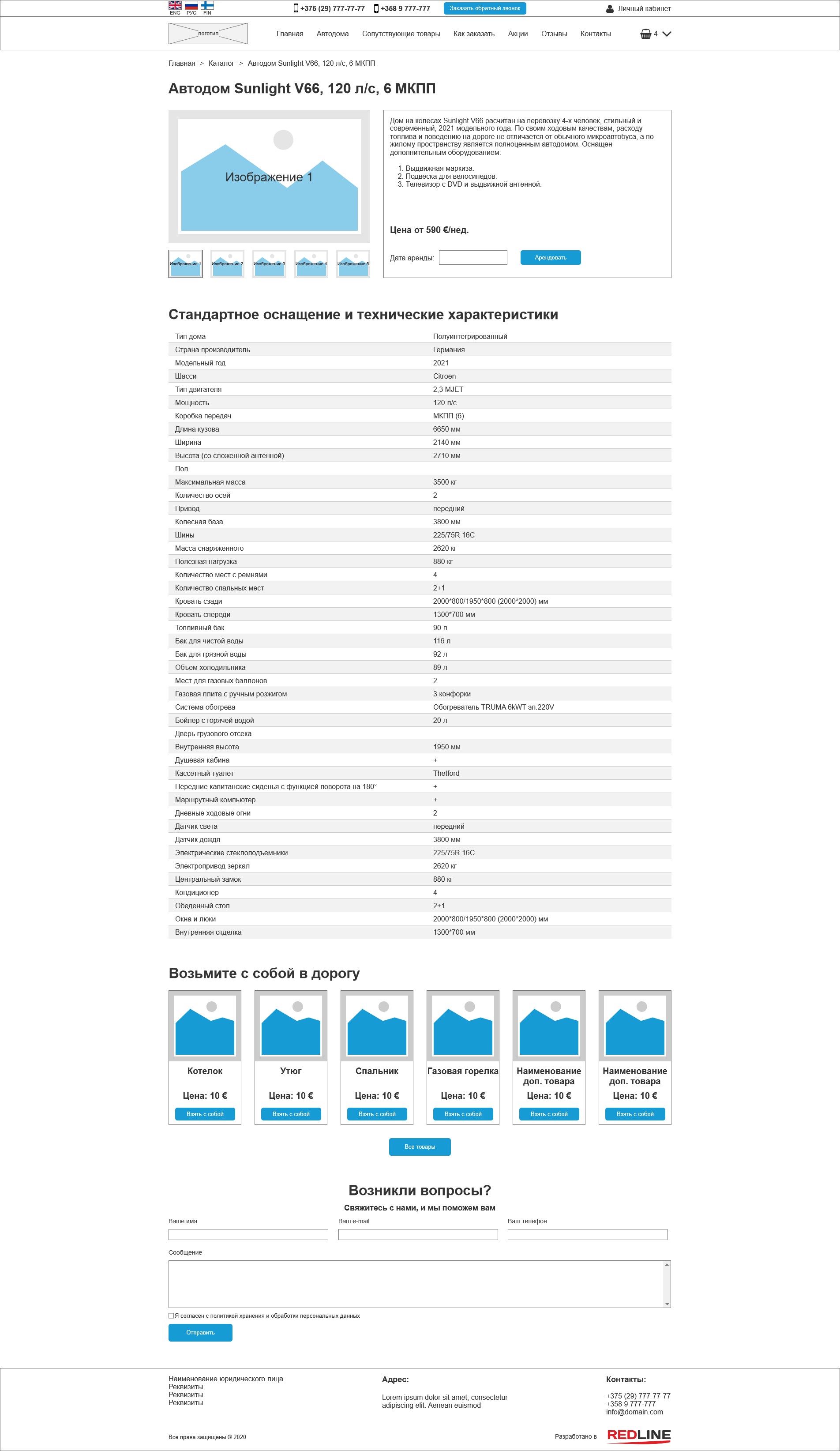 На странице каждого автодома также можно просмотреть фотографии автодома в минигалерее, а также ознакомиться с подробным описанием всех характеристик. Также пользователь может добавить автодом в корзину, как и со страницы каталога, указав предварительно даты бронирования.