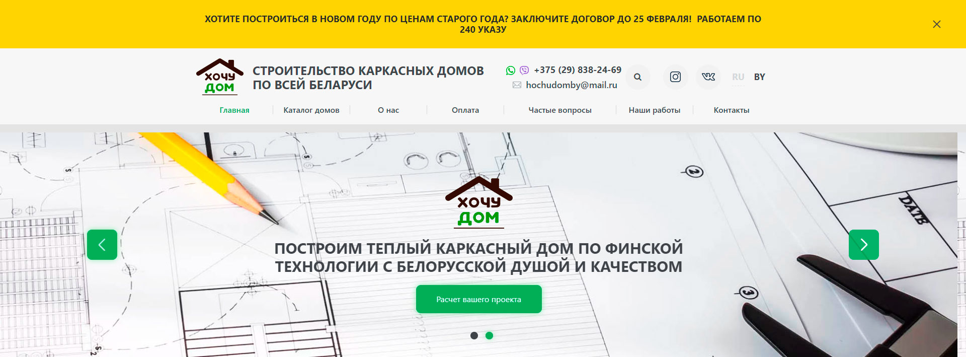 На главной странице представлена подробная информация о проекте «Хочу Дом», преимущества, а также форма для индивидуального расчёта стоимости проекта потенциального заказчика. В верхней части страницы выезжает яркий блок с акциями и временными предложениями.