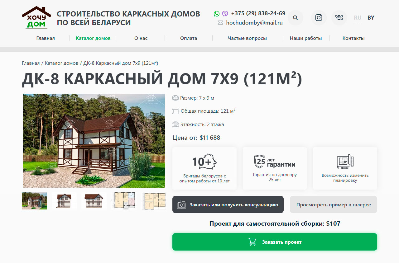 На странице проекта можно рассмотреть фотографии дома с разных ракурсов, а также планировки этажей. Описание и стоимость комплектаций постройки проекта представлены в таблице, где цены меняются автоматически в зависимости от версии сайта (на hochudom.by цены в долларах, на hochu-dom.ru - в рублях).
