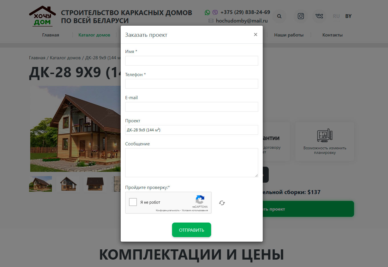 Пользователь может оставить заявку на постройку дома или консультацию по выбранному проекту, или заказать сам проект для самостоятельного строительства. Заявки принимаются через формы в модальных окнах, которые можно вызвать, кликнув по соответствующей кнопке на странице проекта. Поле "Проект" заполняется автоматически.
