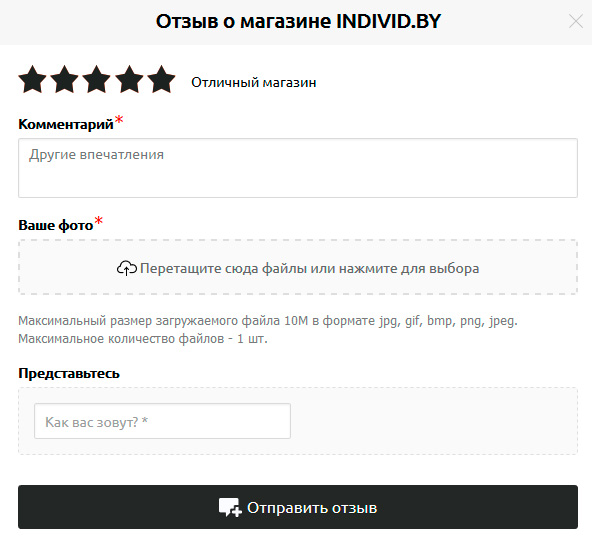 Неотъемлемой частью любого интернет-магазина являются отзывы покупателей. Поэтому на данном сайте также присутствует возможность оставлять отзывы. Посетитель может поставить оценку магазину.