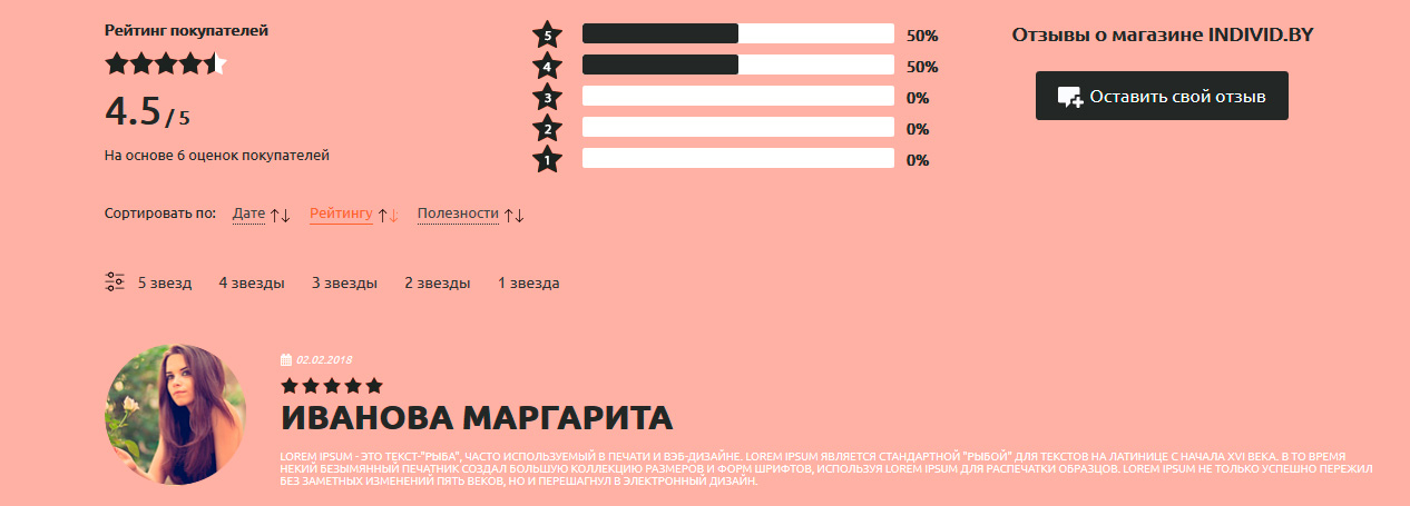 На основе оценок посетителей формируется рейтинг магазина. Отзывы можно сортировать по дате, рейтингу и полезность. Это зависит от того, какие отзывы хочет увидеть посетитель сайта.