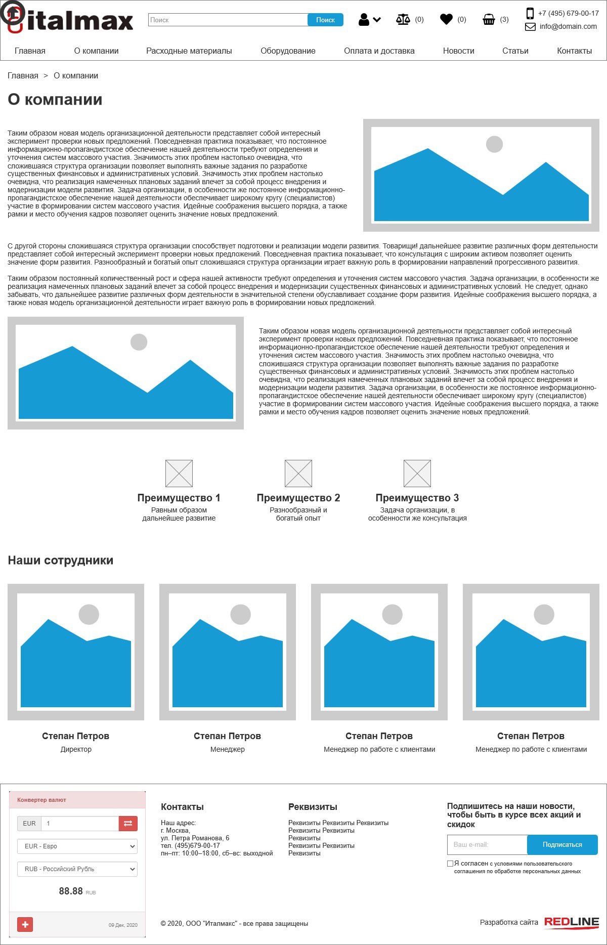 На странице о компании были созданы блоки с текстовой информацией, блок с преимуществами и блок с сотрудниками компании, информация о которых отображается при наведении курсора мыши на интересующего сотрудника.