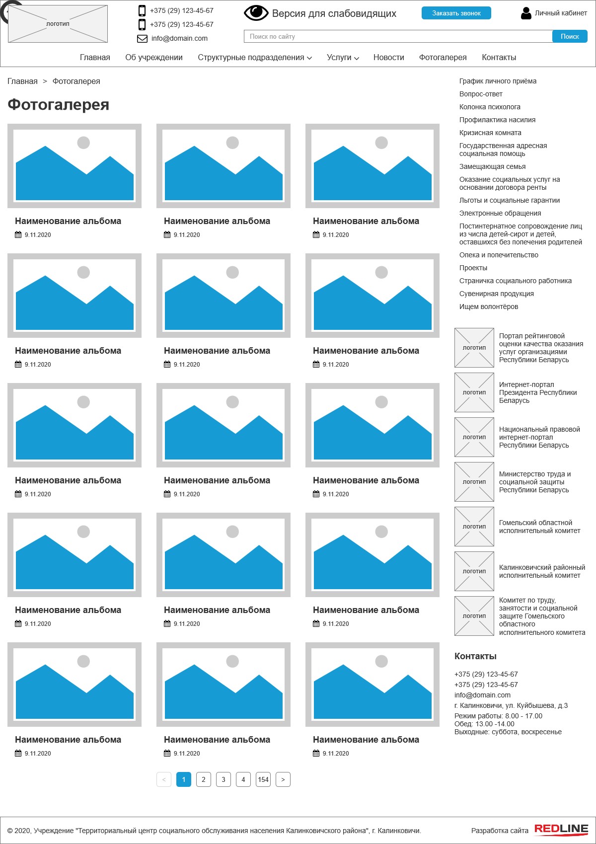 Аналогичным образом реализованы разделы "Фотогалерея" и "Новости", в которых дополнительно у каждого альбома или новости выводится дата публикации.