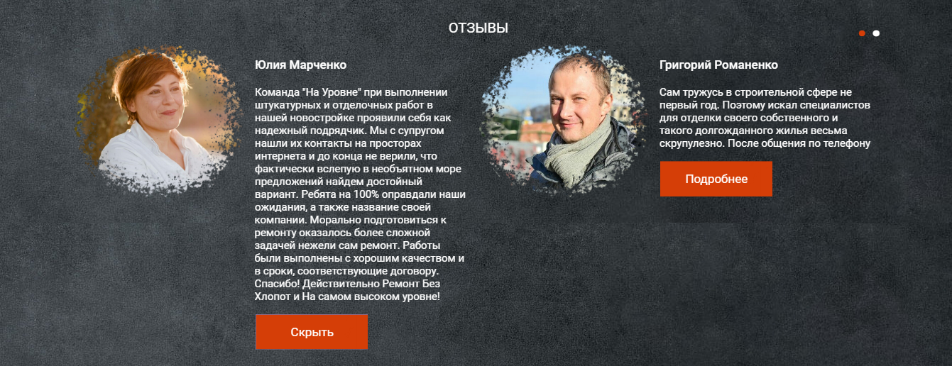 Отзывы реализованы через слайдер. Нажав на кнопку "Подробнее", можно развернуть отзыв полностью, а затем свернуть.