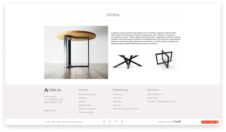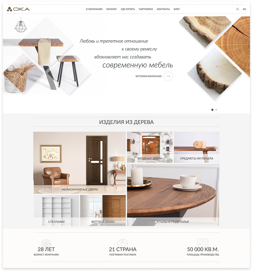 Дизайн сайта выполнен в современном асимметричном стиле, с акцентом на визуальную подачу продукции. Чистый светлый фон создаёт ощущение пространства и лёгкости, а крупные фотографии мебели и дверей подчёркивают качество и детали изделий. В оформлении использованы нейтральные тона и аккуратная типографика, благодаря чему сайт выглядит стильно и профессионально. Такой визуальный подход отражает эстетику компании ОКА — сочетание современности и сдержанной элегантности. Ассиметричная сетка и крупные изображения делают интерфейс динамичным, но при этом не перегруженным.
