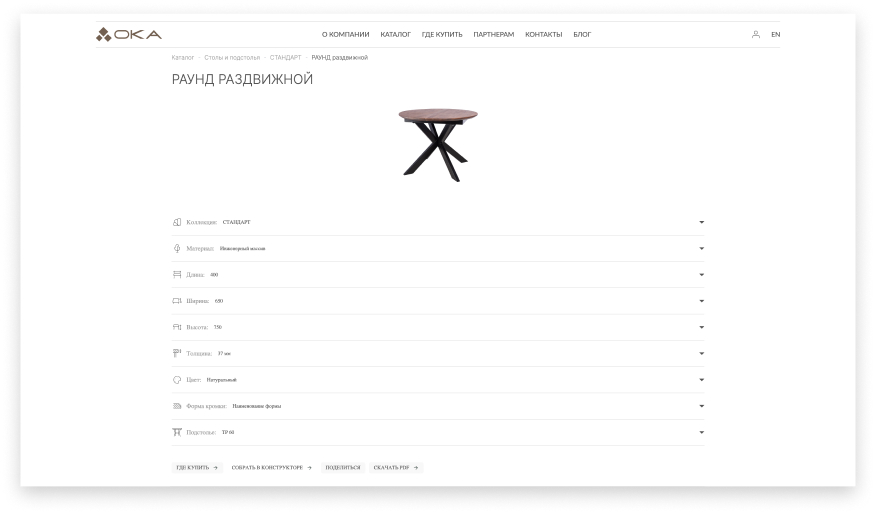 Дизайн карточки выполнен в едином стиле с остальными страницами сайта: чистый фон, крупные фото, аккуратная типографика и логичное расположение блоков. Такой подход обеспечивает комфортное восприятие информации и помогает максимально наглядно представить продукцию компании.
