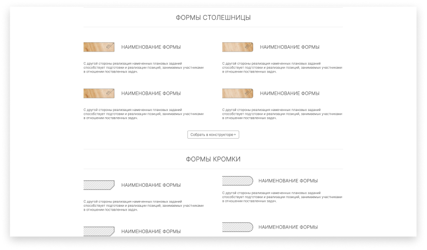 Каталог на сайте выполнен в нестандартном формате — с верхними табами, которые позволяют быстро переходить между основными категориями продукции. Каждая категория представлена отдельным блоком с названием, кратким описанием, кнопкой для перехода и крупными асимметрично расположенными фотографиями. Такой подход делает структуру каталога удобной и визуально выразительной, помогая пользователю с первого взгляда ориентироваться в ассортименте и находить нужный раздел.