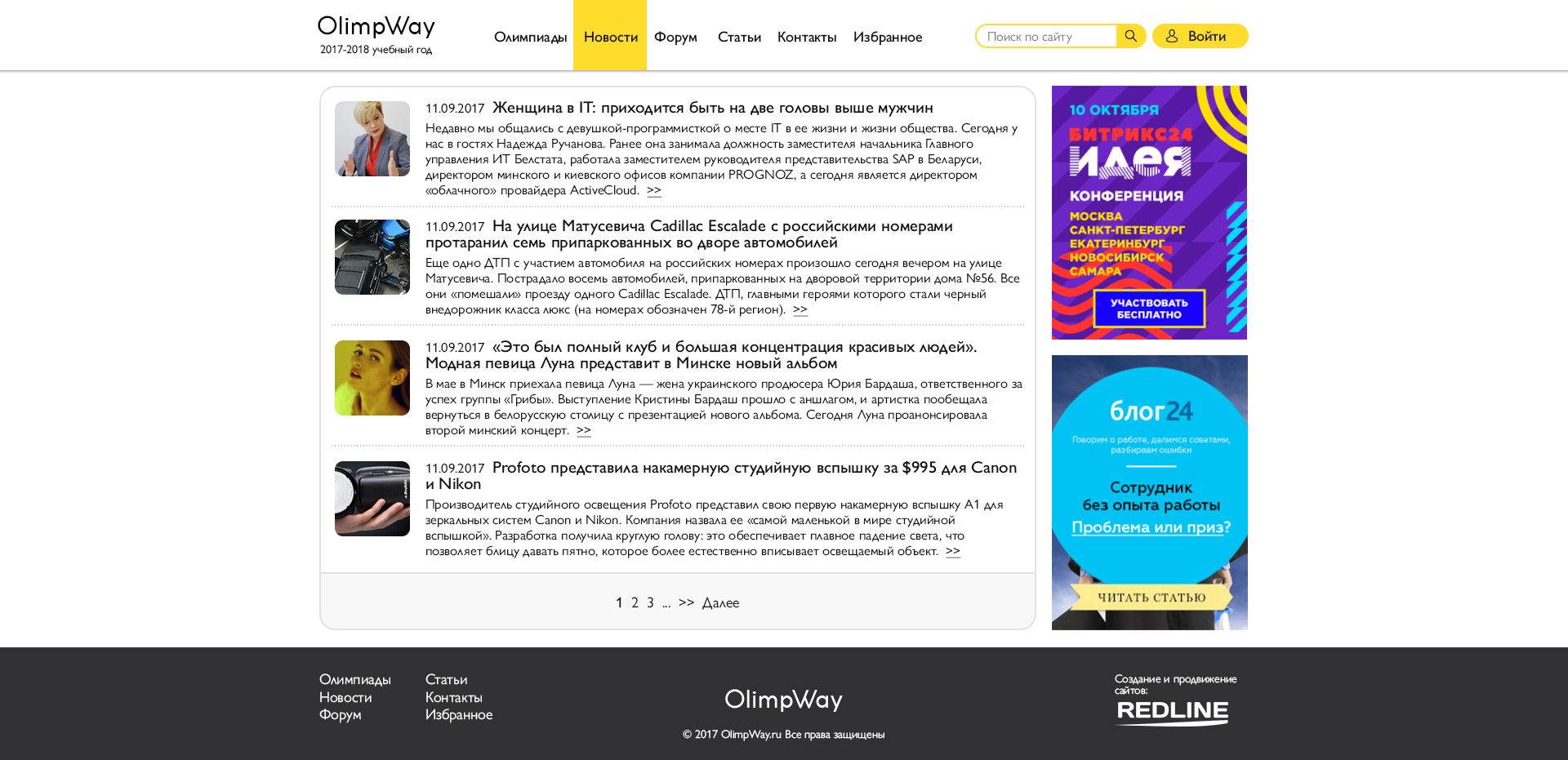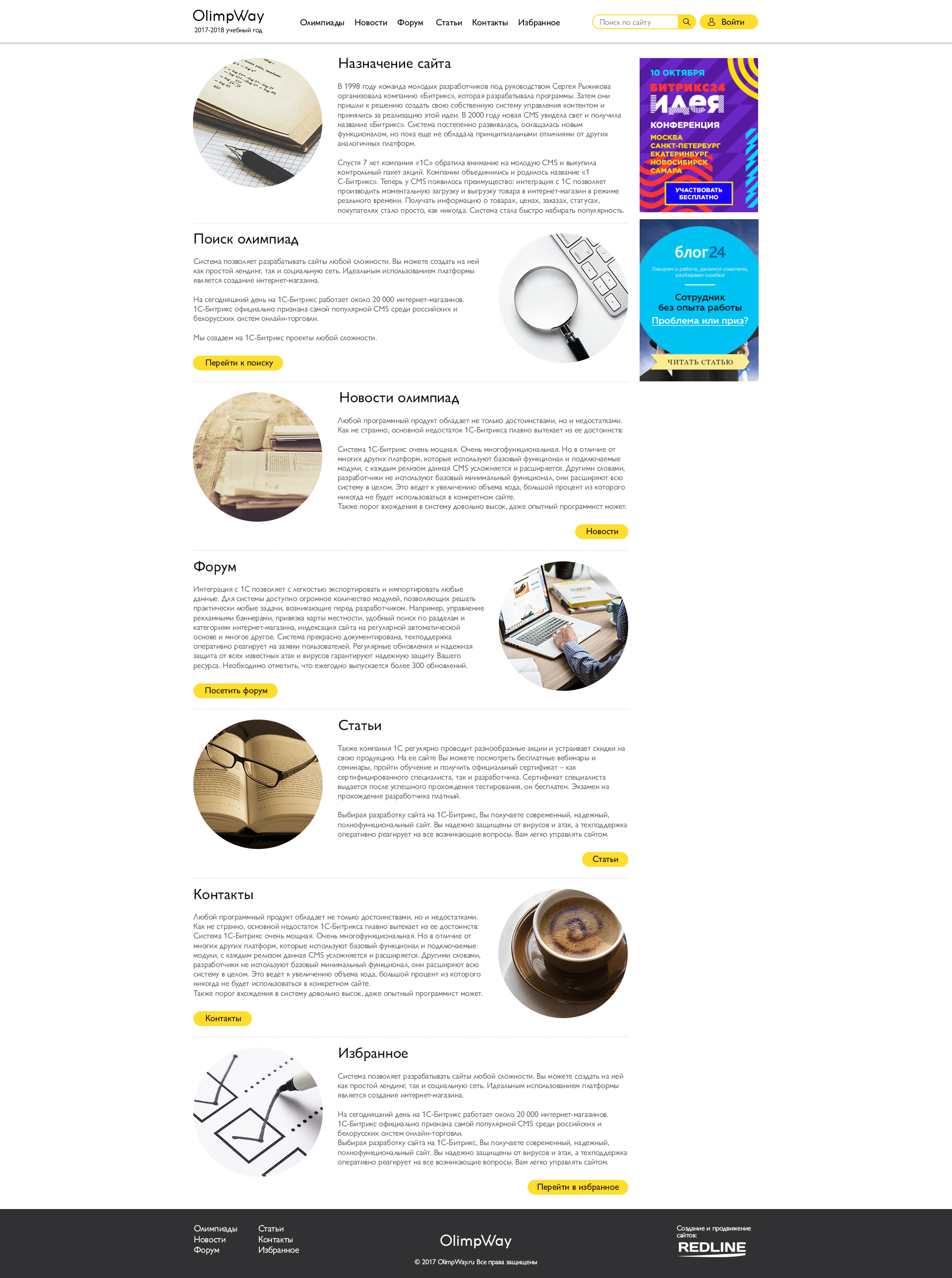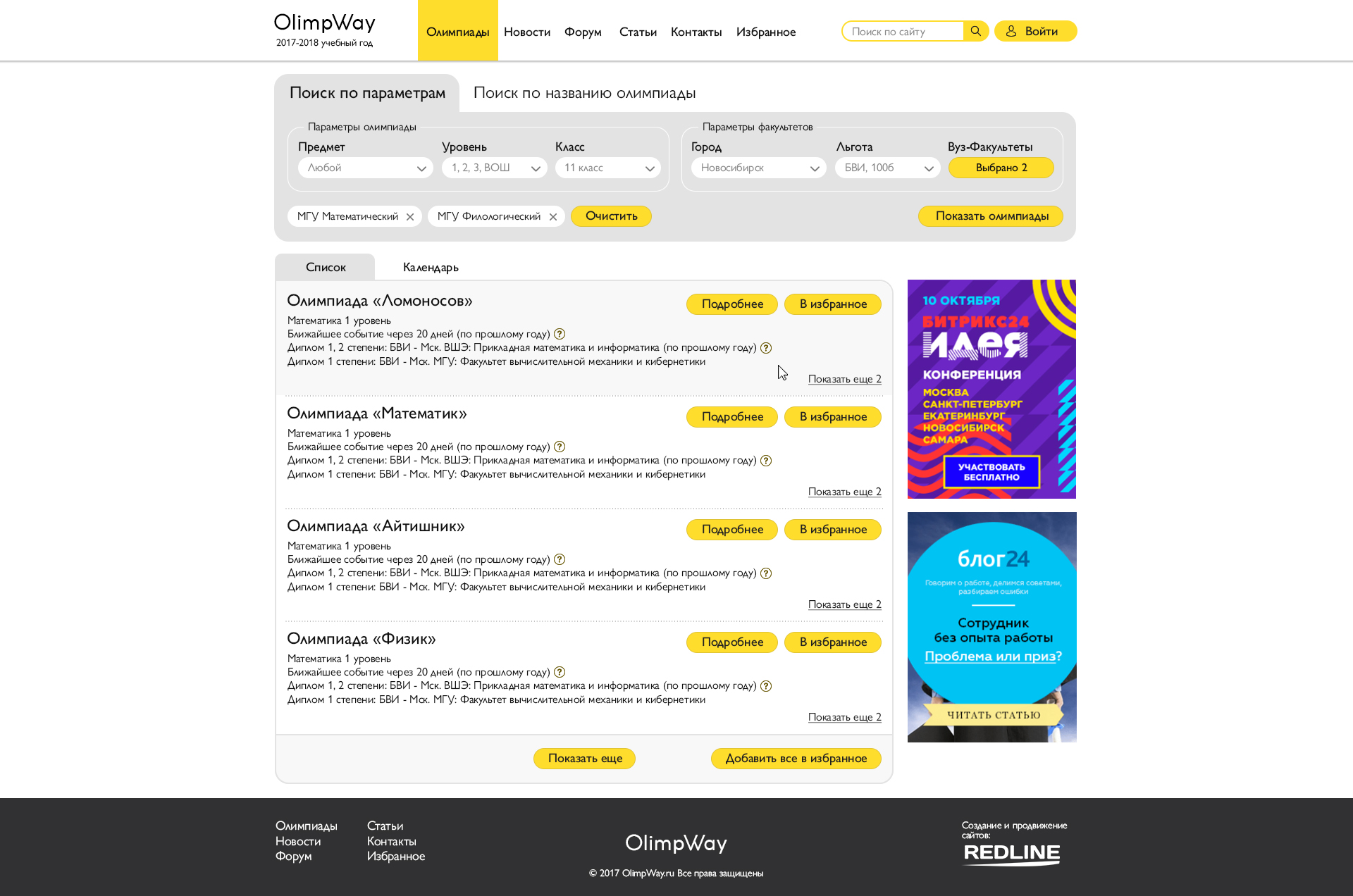 В остальных вкладках можно прочитать новости и статьи про олимпиады. От форума на сайте заказчик позже отказался. По его просьбе справа на сайте были размещены баннеры для монетизации сайта.