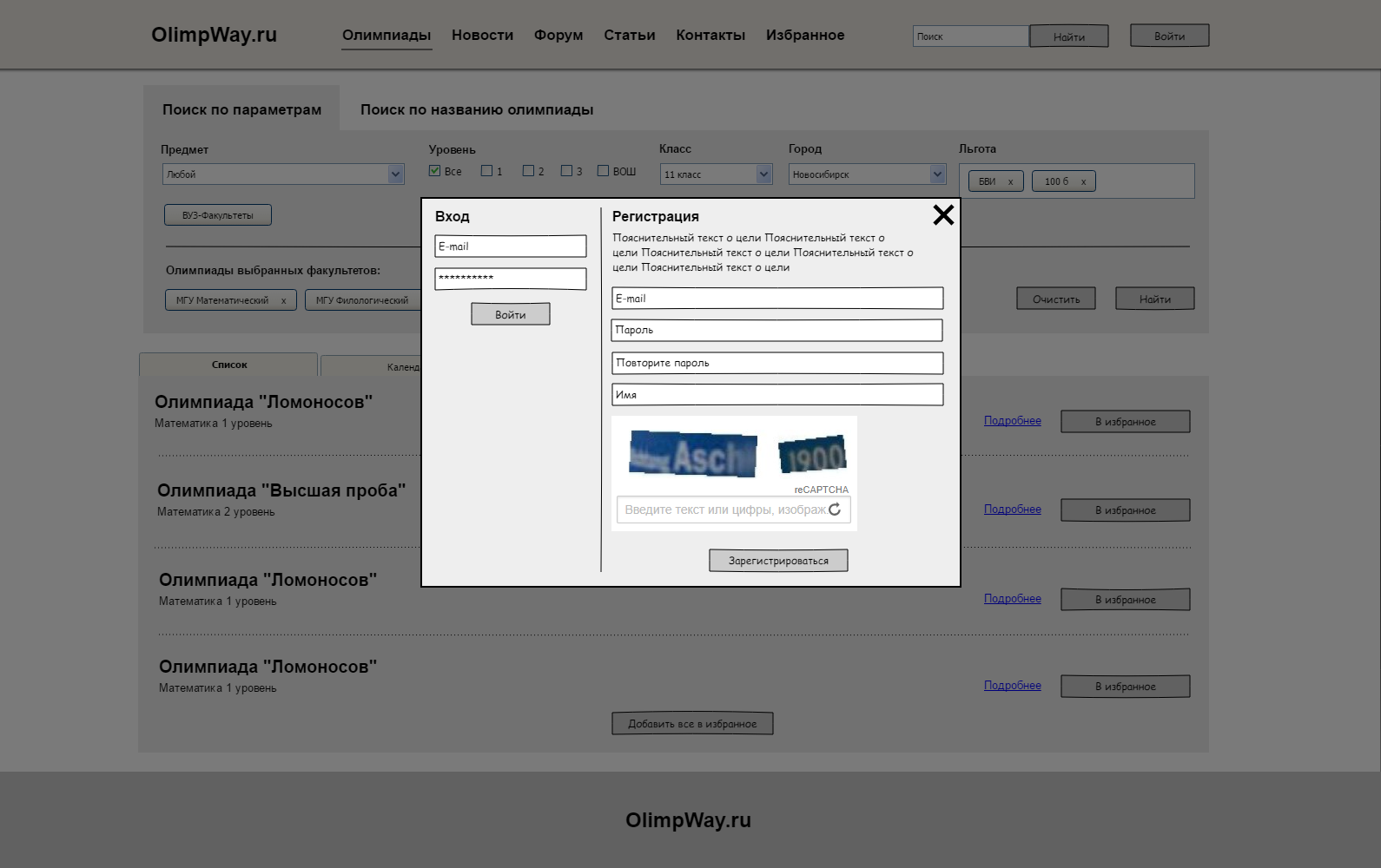 Во вкладке Олимпиады можно подобрать список высших учебных заведений, куда абитуриент может поступить. Для этого необходимо заполнить параметры олимпиады и факультетов. После этого покажется список вузов с определенными льготами для поступления.