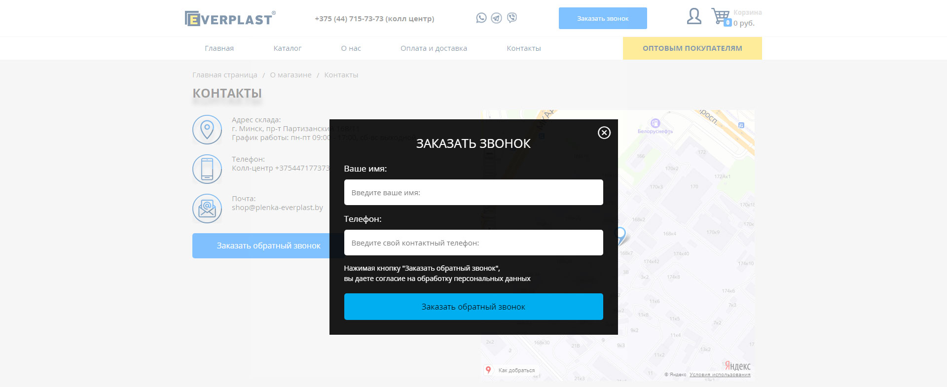 На странице "Контакты" находится интерактивная карта и кнопка заказа обратного звонка, при нажатии на которую появляется форма обратной связи.