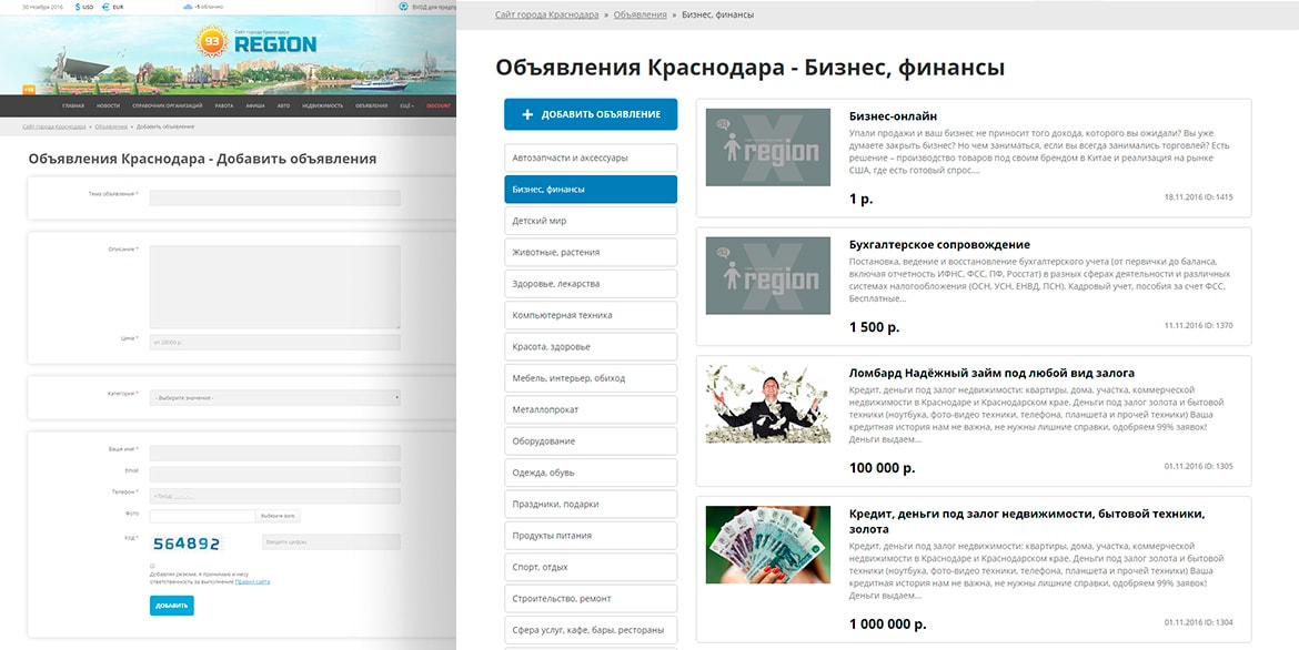 Пользователь может разместить объявление на сайте благодаря специально разработанному модулю.