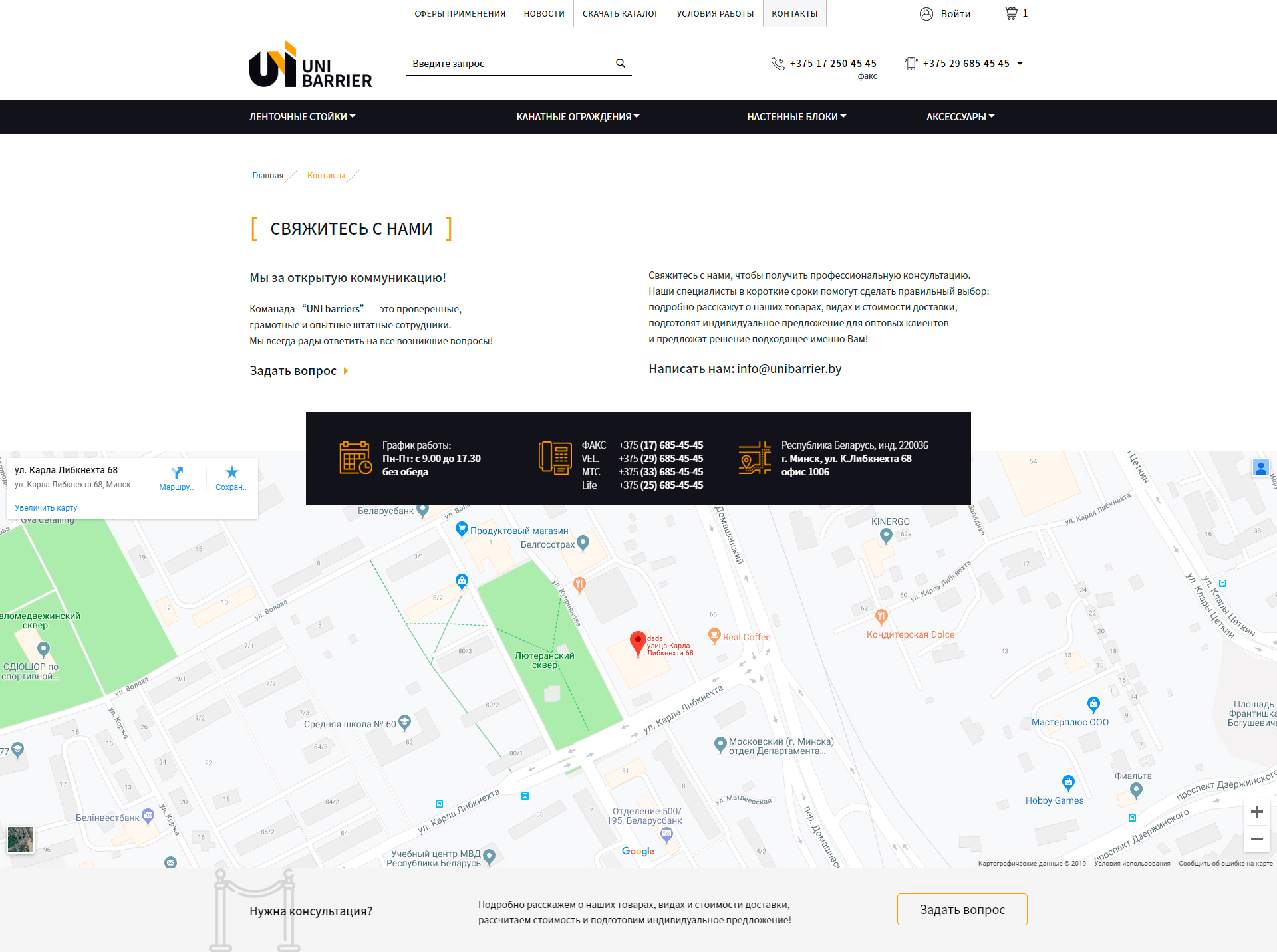 На странице "Контакты" расположена интерактивная карта с отмеченным на ней адресом. Здесь же расположены все контакты, информация о компании и форма обратной связи.