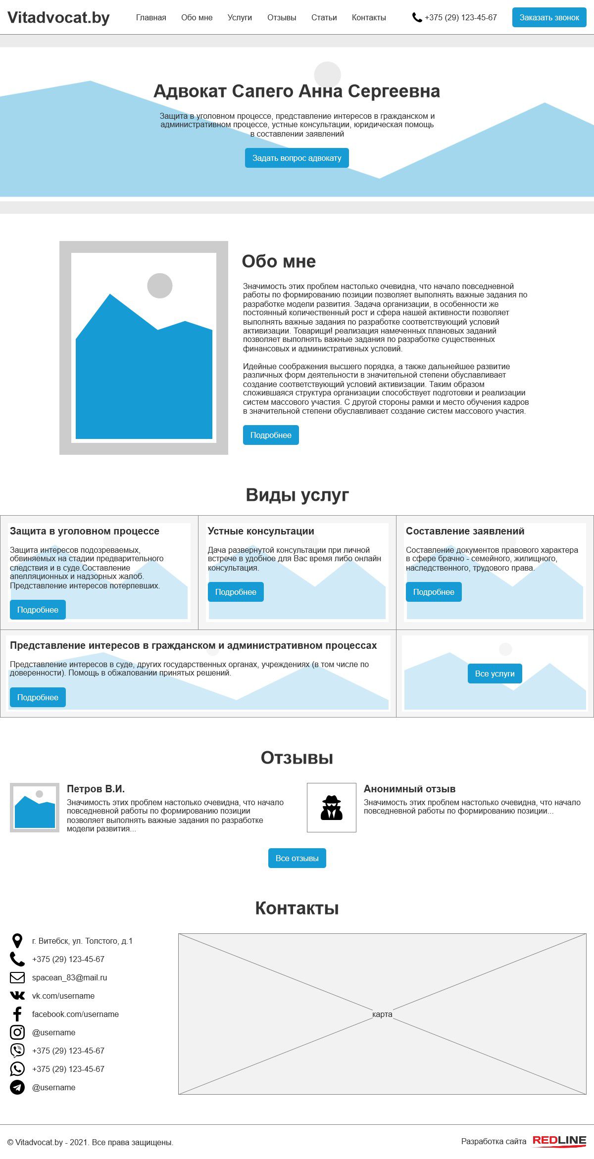 На главной странице реализованы блоки с описанием работы адвоката, блок с главными услугами, блок отзывов и контактной информацией.