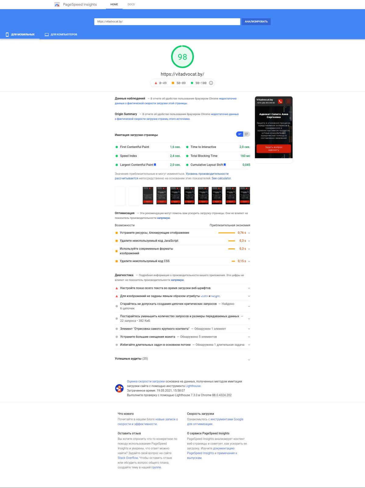 Задача: Разработать сайт-визитку для продвижения и рекламы услуг в интернете, выполнить оптимизацию скорости загрузки сайта.