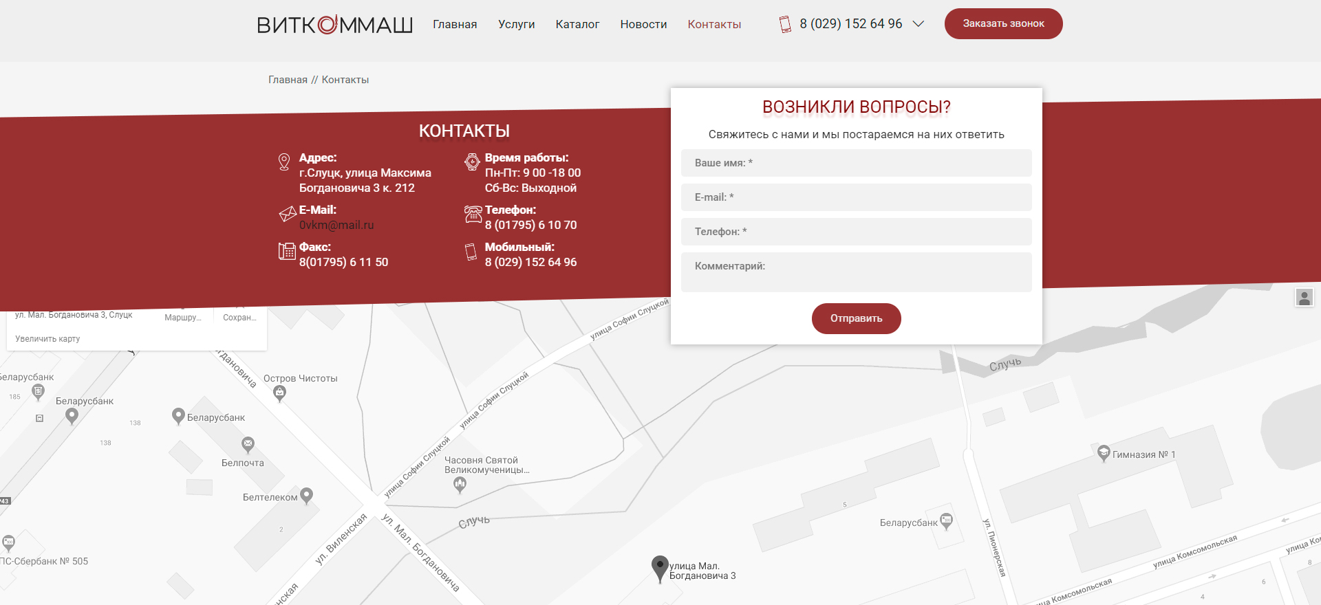 На странице "Контакты" расположена интерактивная карта с отмеченным на ней адресом. Здесь же расположены все контакты, информация о компании и форма обратной связи.