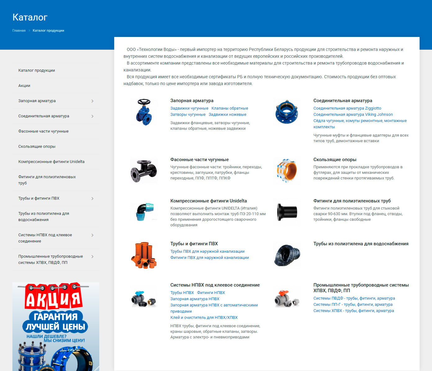 Наиболее важным разделом сайта является каталог товаров. Он разделён на категории, которые представлены небольшими блоками с изображением и ссылками на подкатегории. Категории дублируются удобным меню слева.