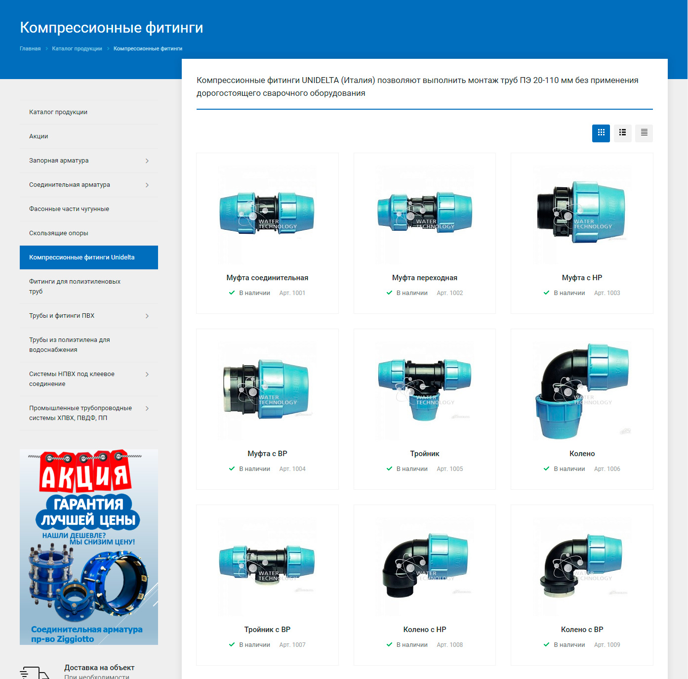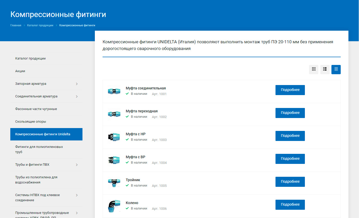 Каждый раздел каталога содержит карточки товаров со стикерами акций и ключевой информацией о товаре: изображение, наименование, артикул и наличие на складе. Способ отображения товаров в каталоге можно изменить, кликнув по соответствующей иконке.