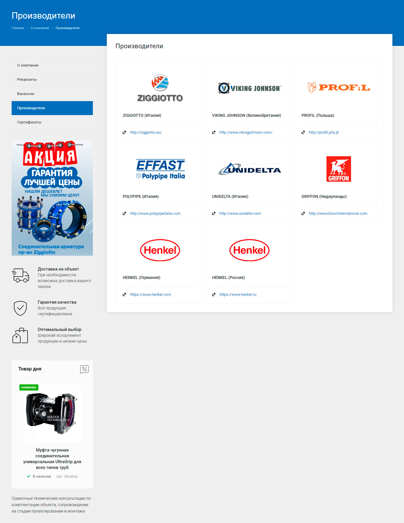 Как в каталоге, так и на страницах разделов "Компания" и "Информация" в левой части всегда доступны баннер с акциями и карточка из каталога "Товар дня".
