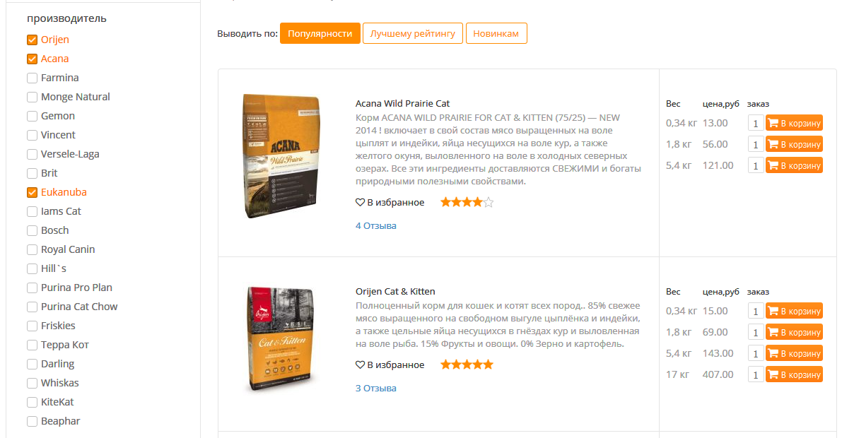 В каталоге можно подобрать своему питомцу любой продукт в зависимости от возраста, веса и индивидуальных особенностей или используя фильтры характеристик.